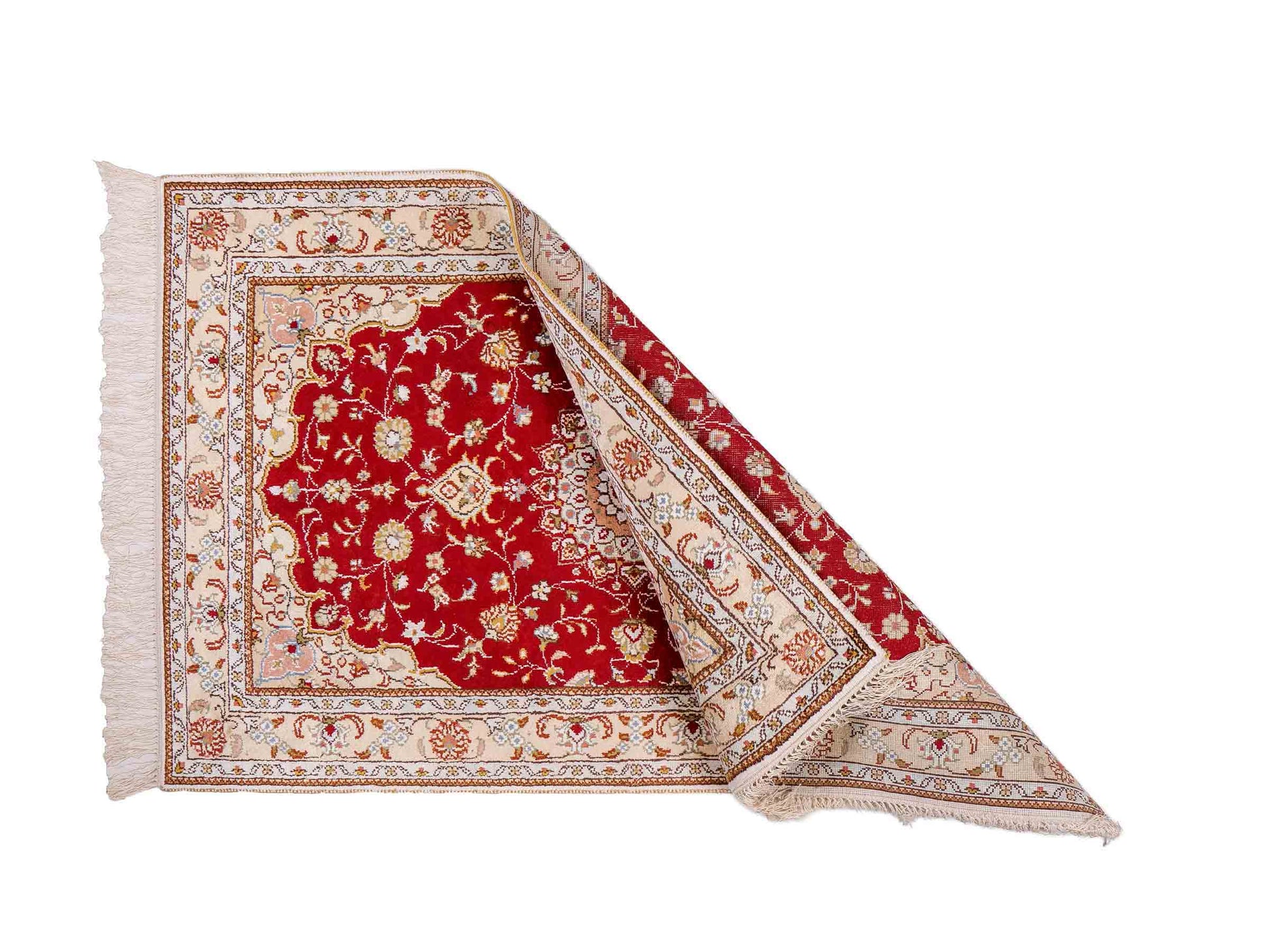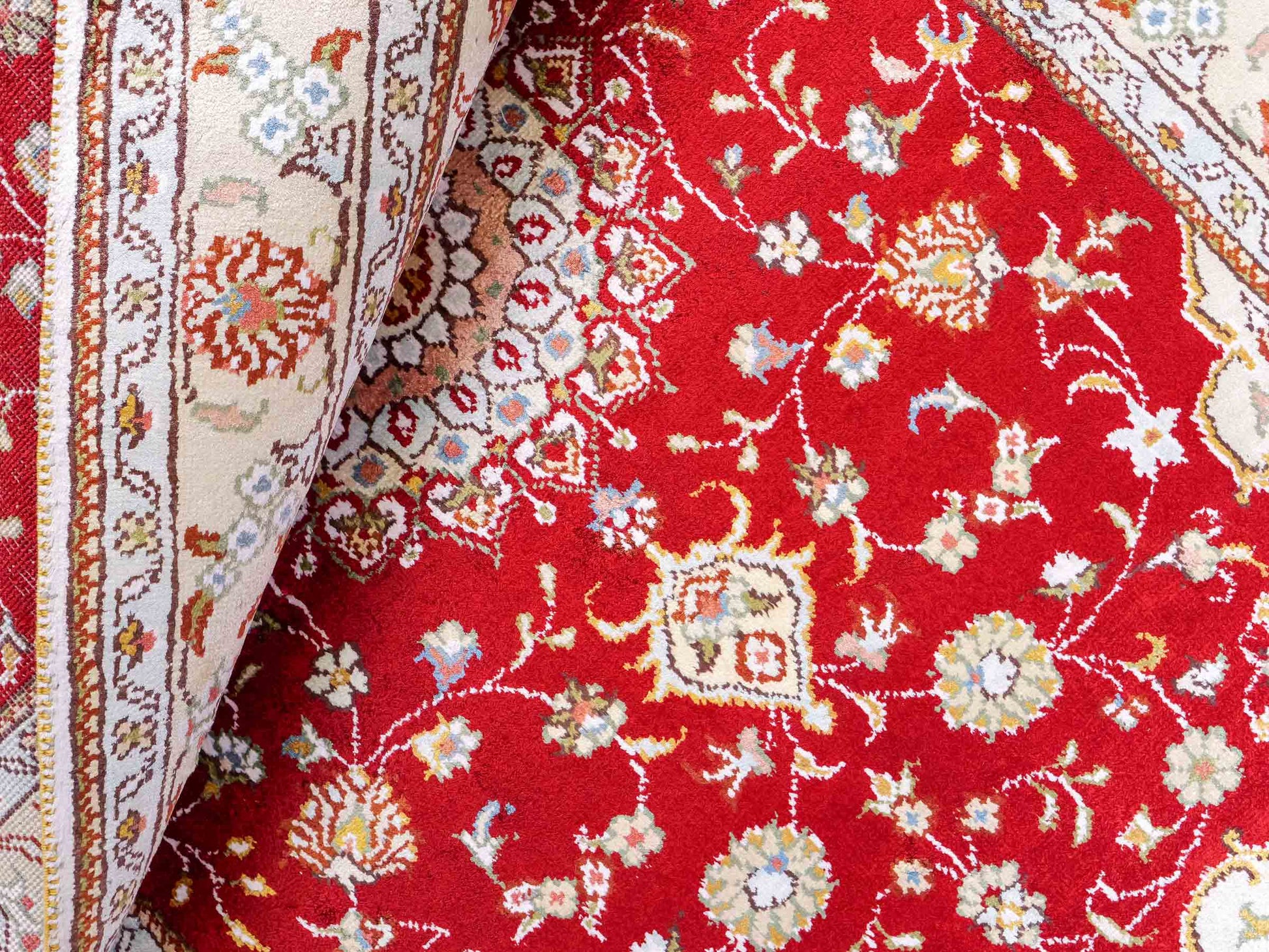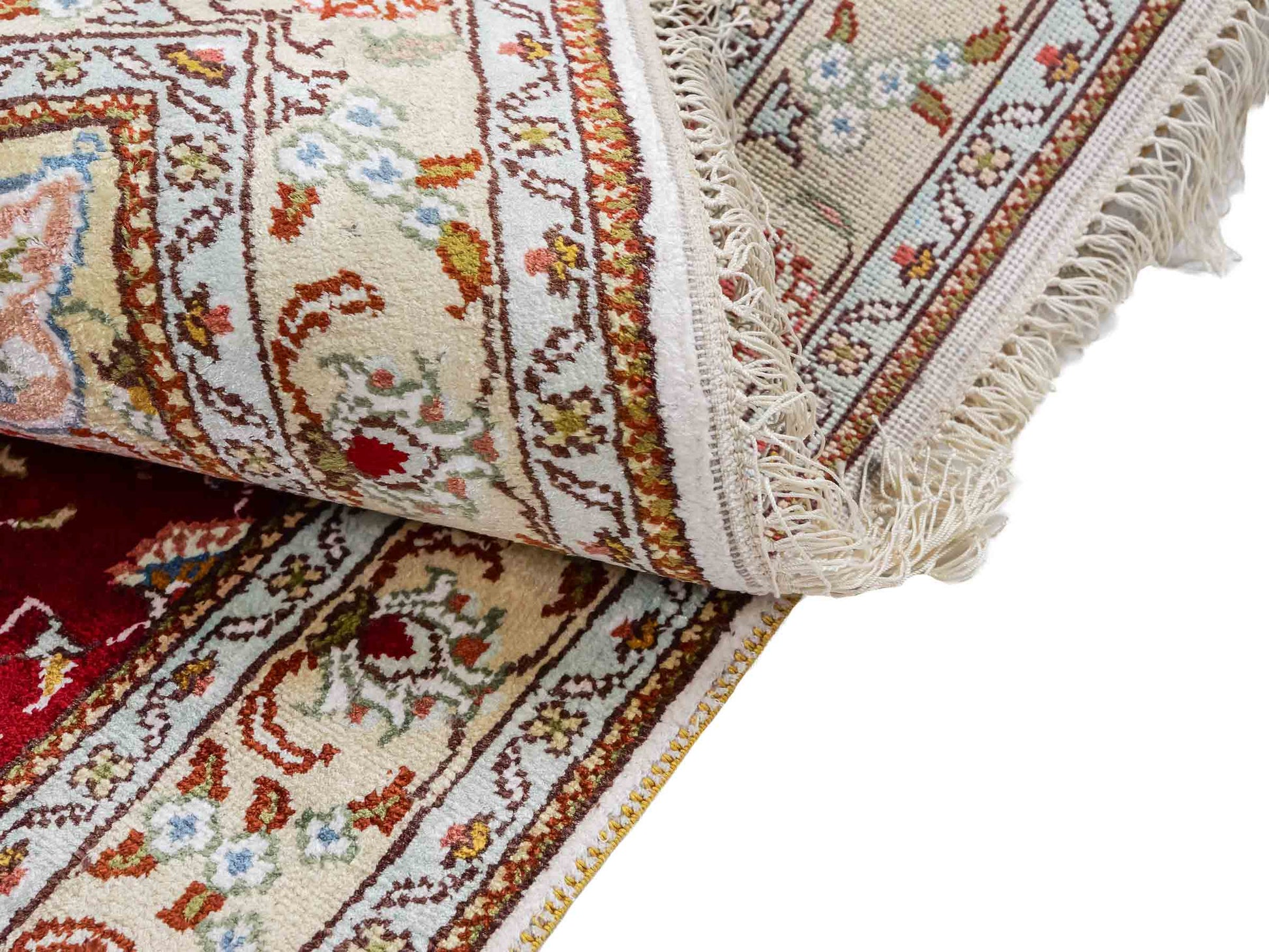 Wool with Silk: These rugs require particularly careful storage, as the combination of wool and silk makes both materials sensitive. Store them in a cool, dry place away from direct sunlight. A constant temperature of about 18 degrees Celsius is ideal. Use breathable cotton dust covers to protect the rug while ensuring ventilation. Regular inspections help to detect mold and pests early.
