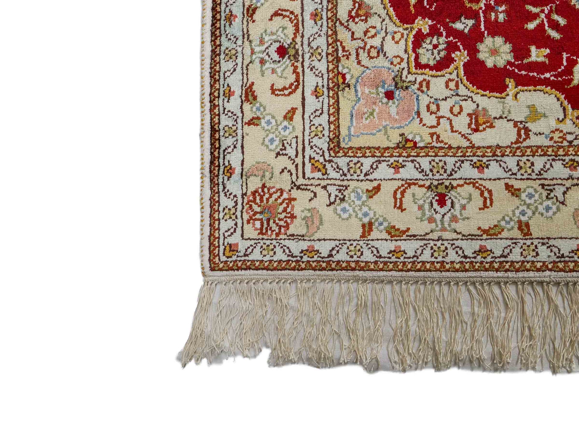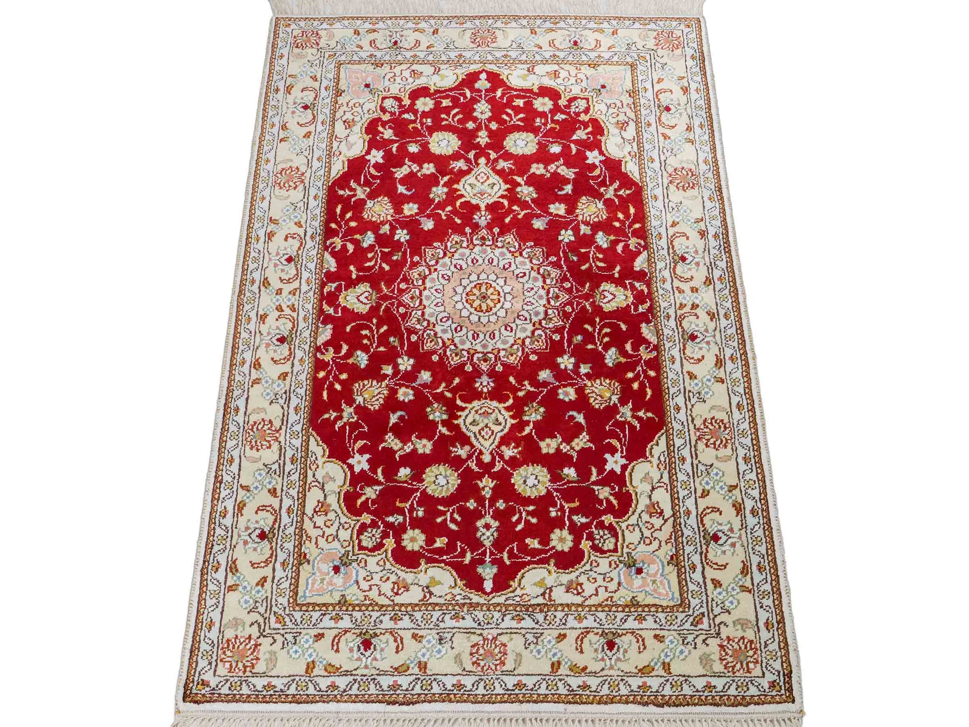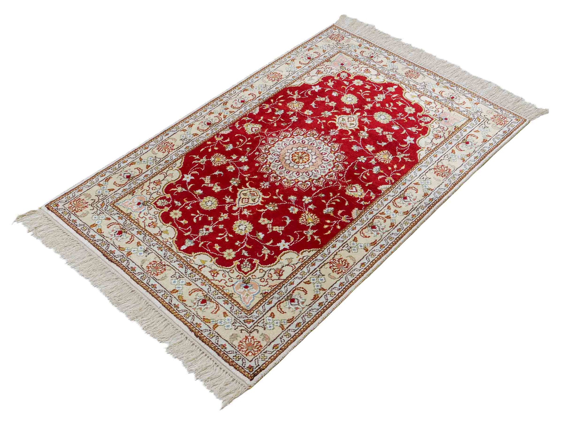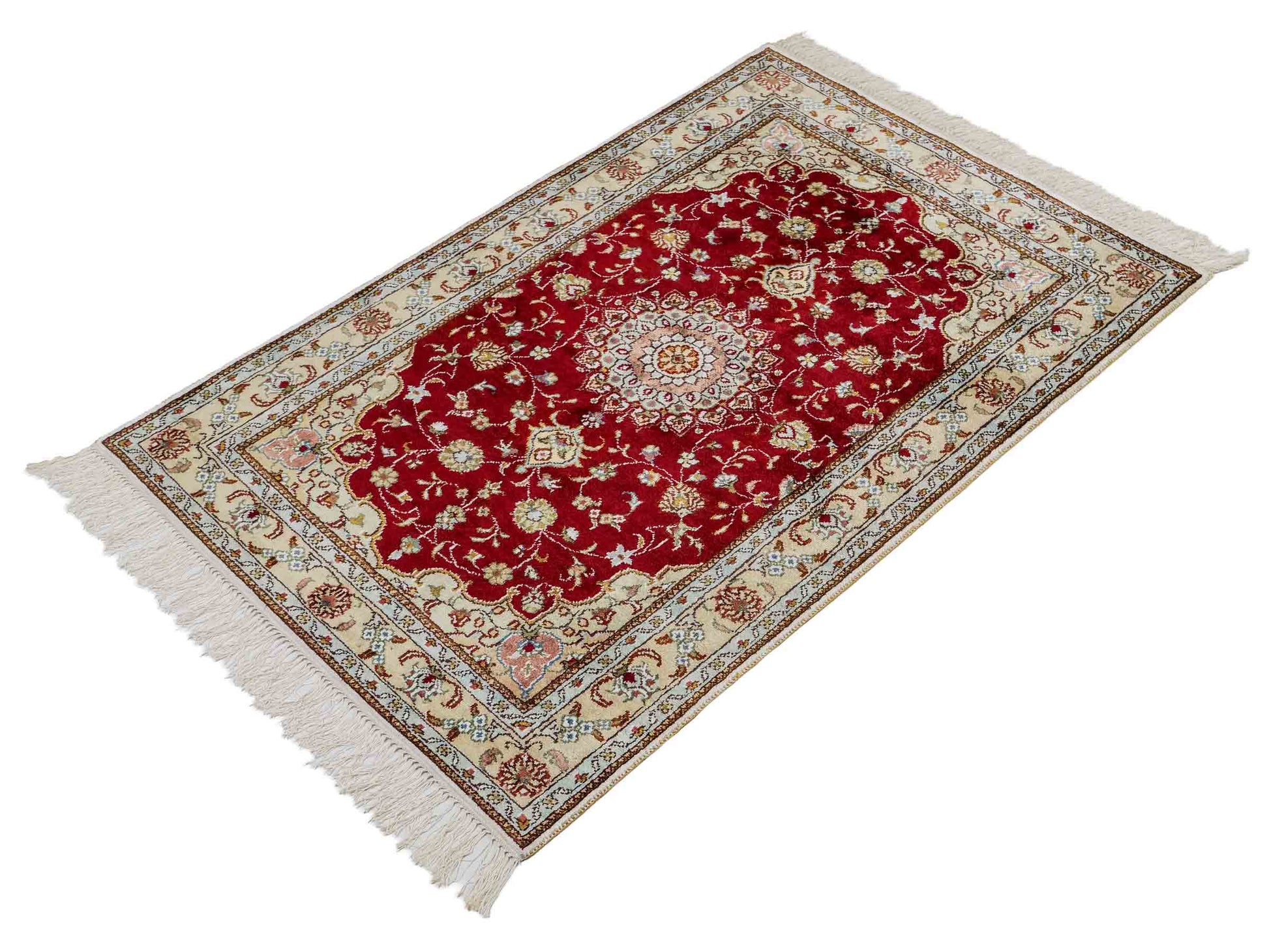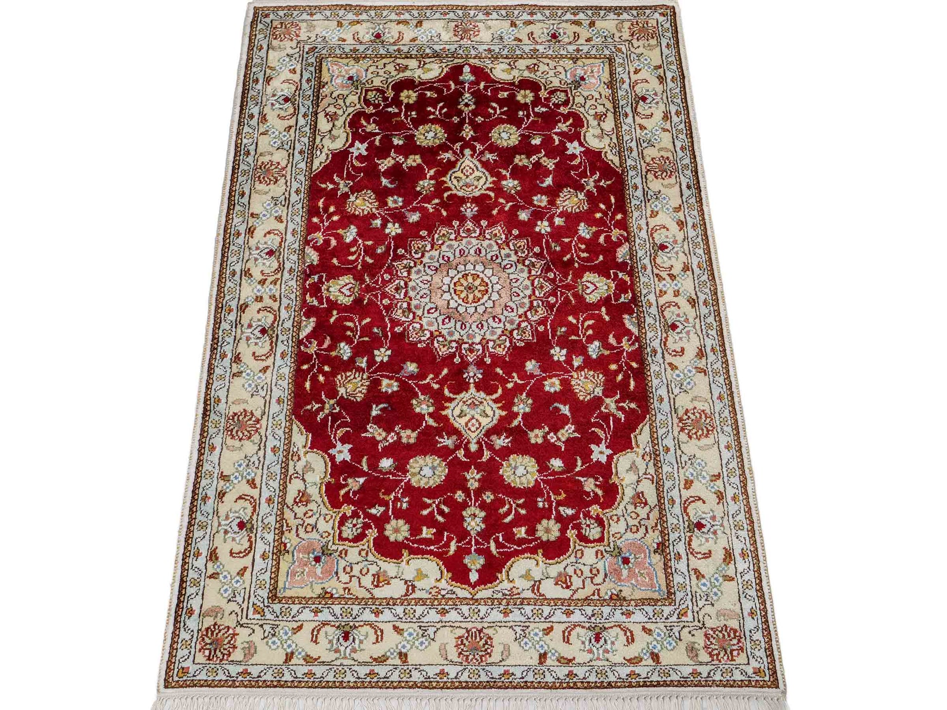 Handcrafted in the traditional way in China, this unique piece impresses with its classic Qom design and timeless color palette.