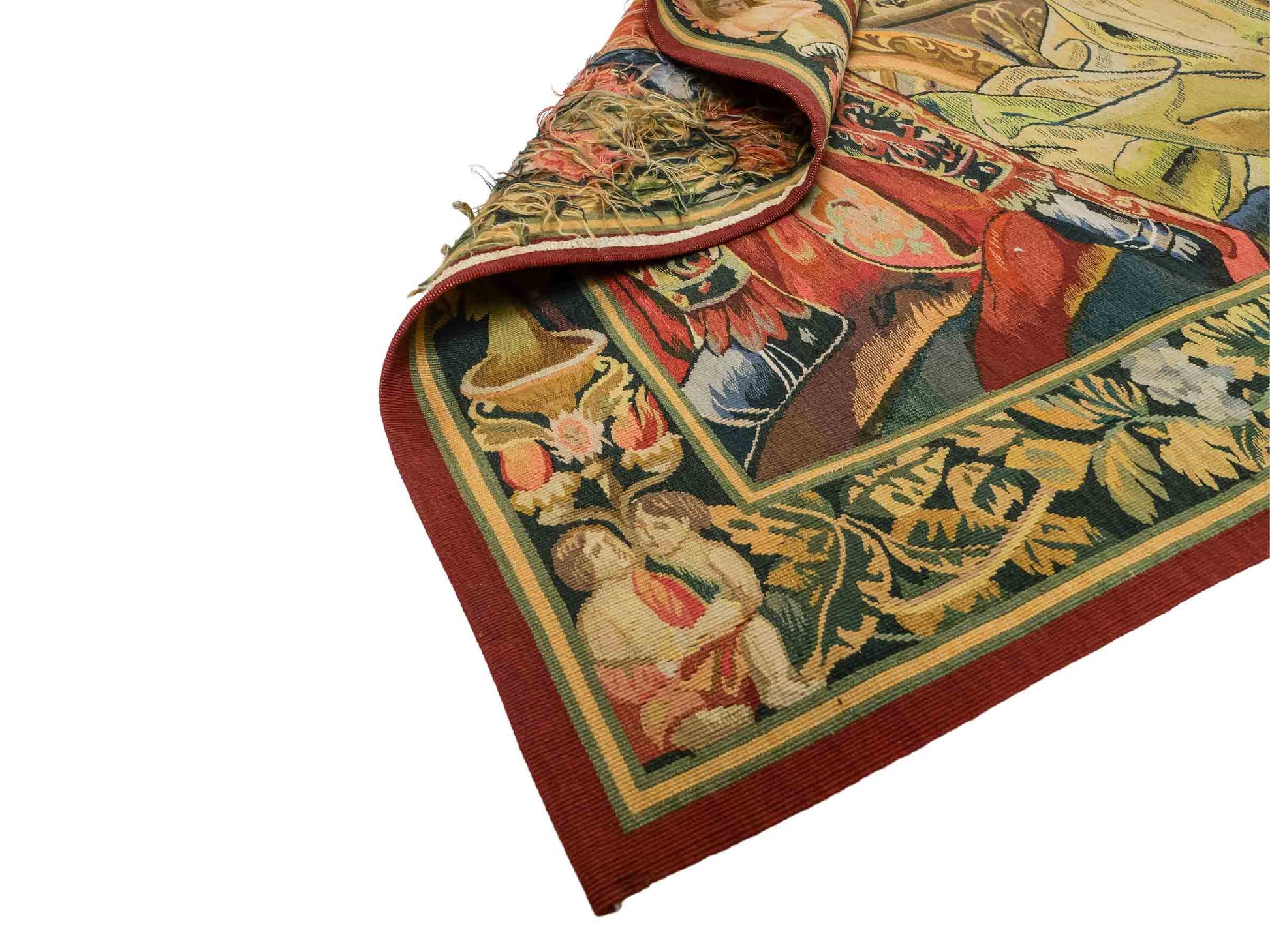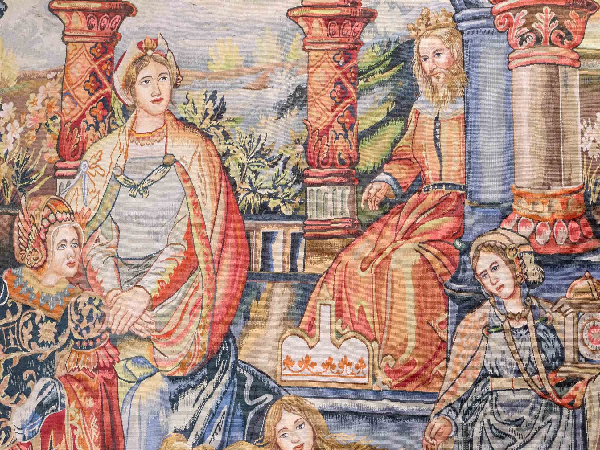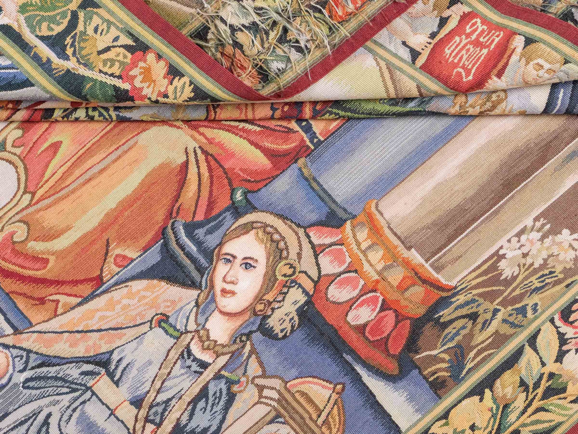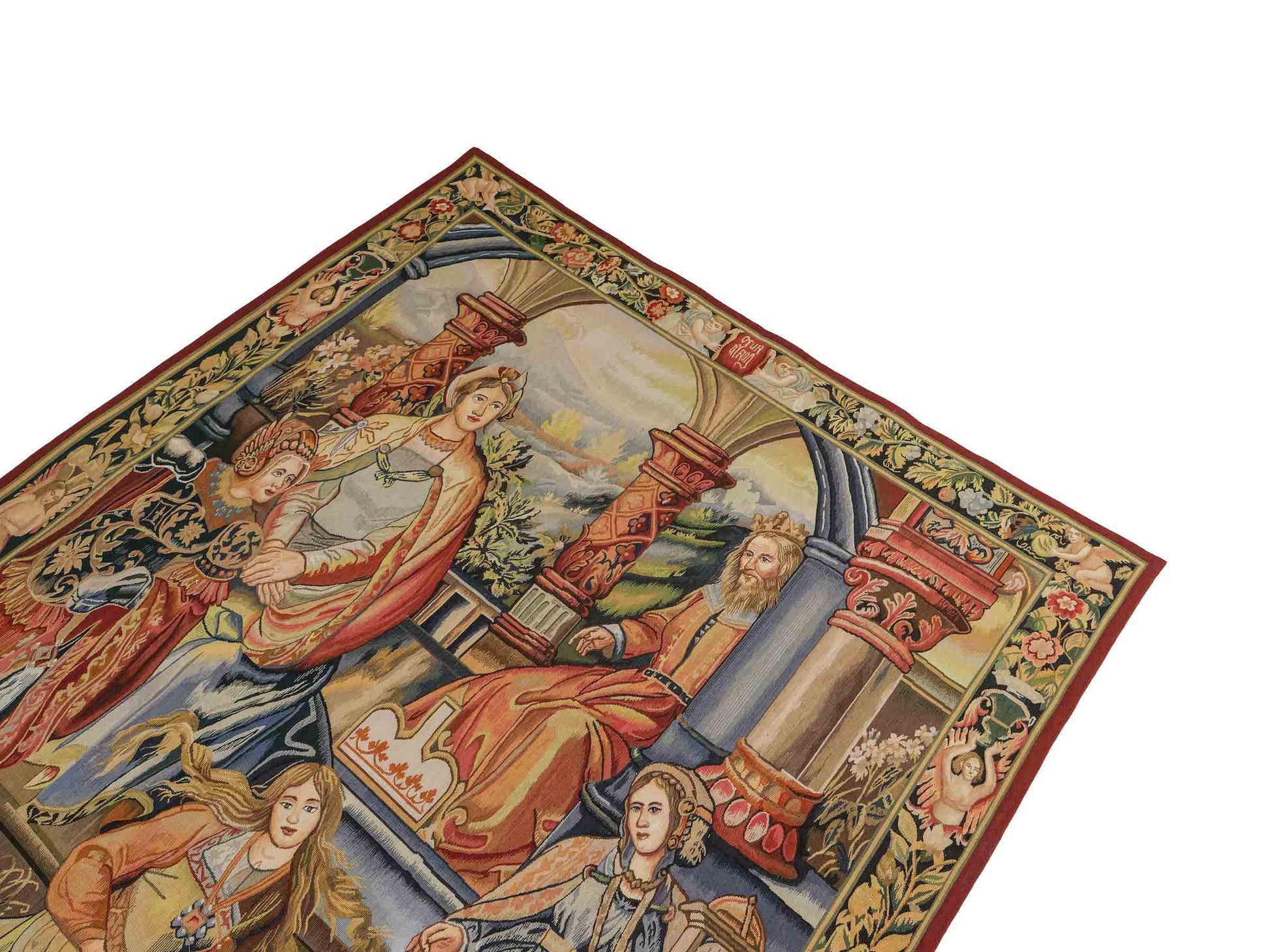 Embark on a journey through time with this handcrafted Chinese wall tapestry in a charming Gobelin design. The floral border, adorned with cherubs, frames an impressive tableau depicting five people—one, crowned and dressed in splendid garments, is seated in a throne room supported by ornate columns. In the background, nature unfolds, creating a fascinating contrast to the opulent scene.