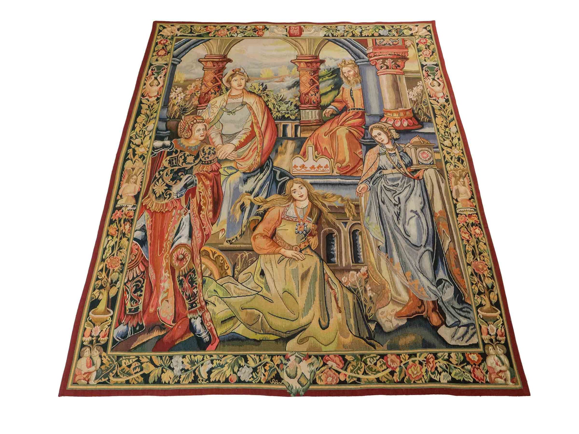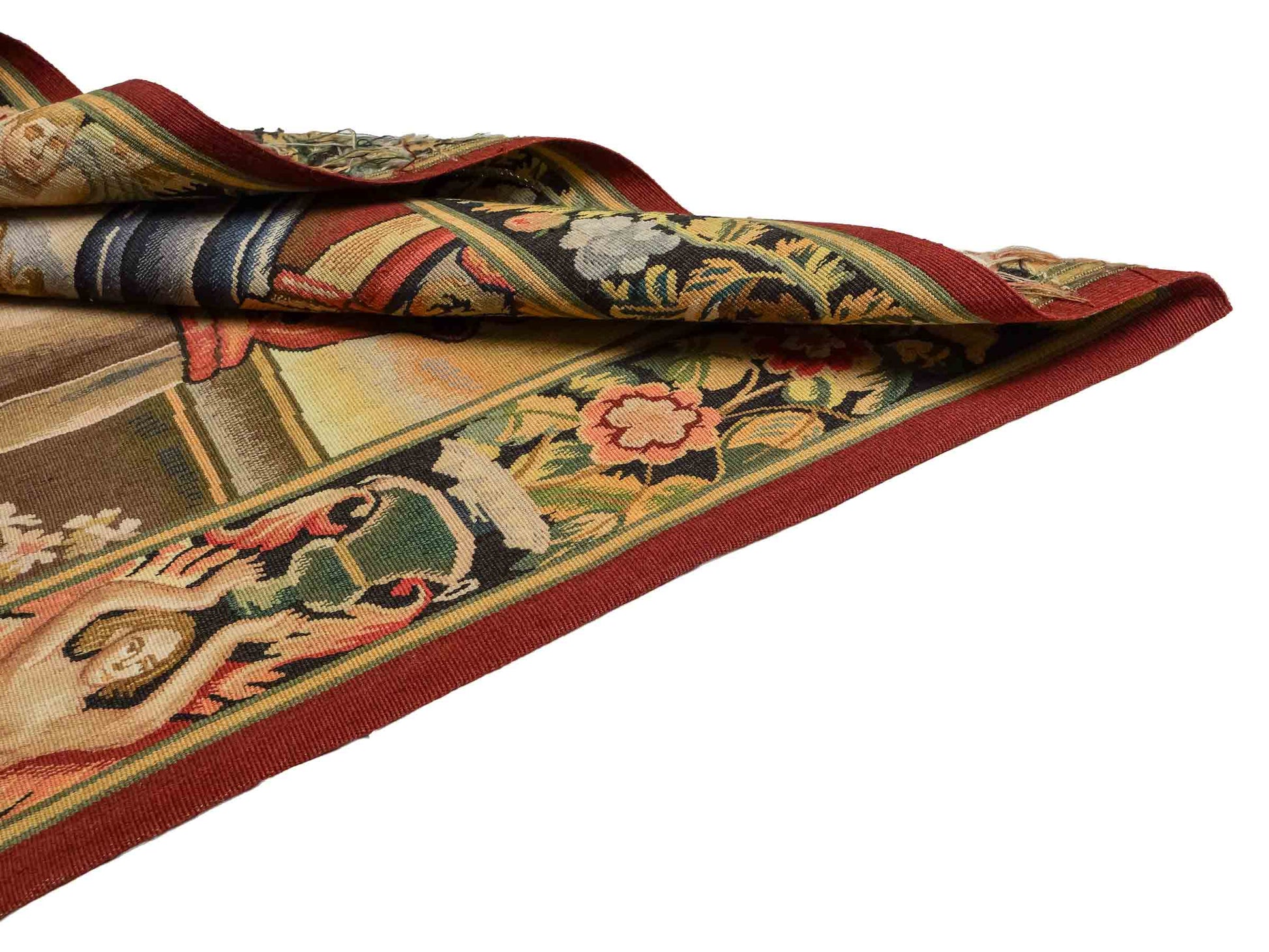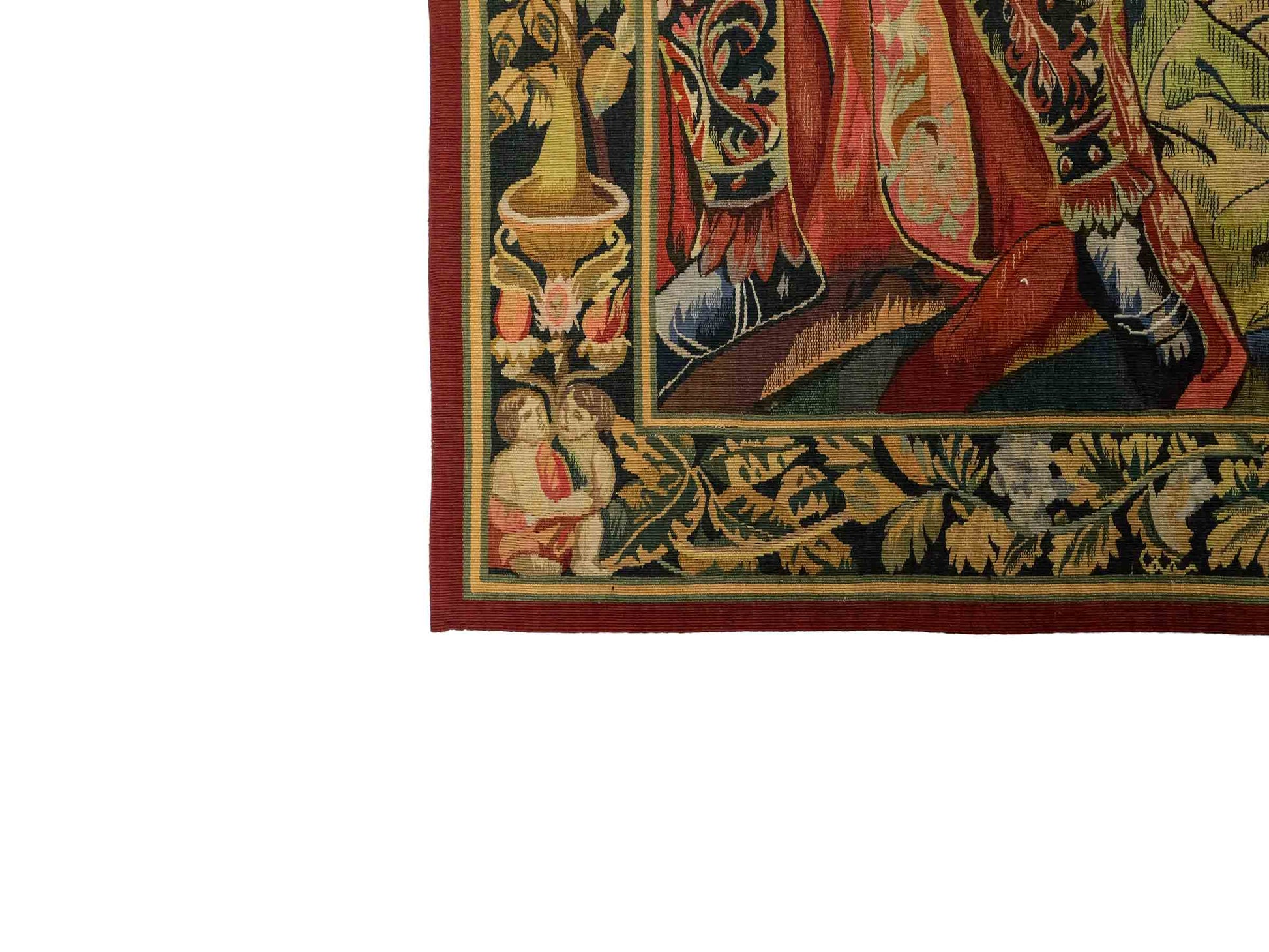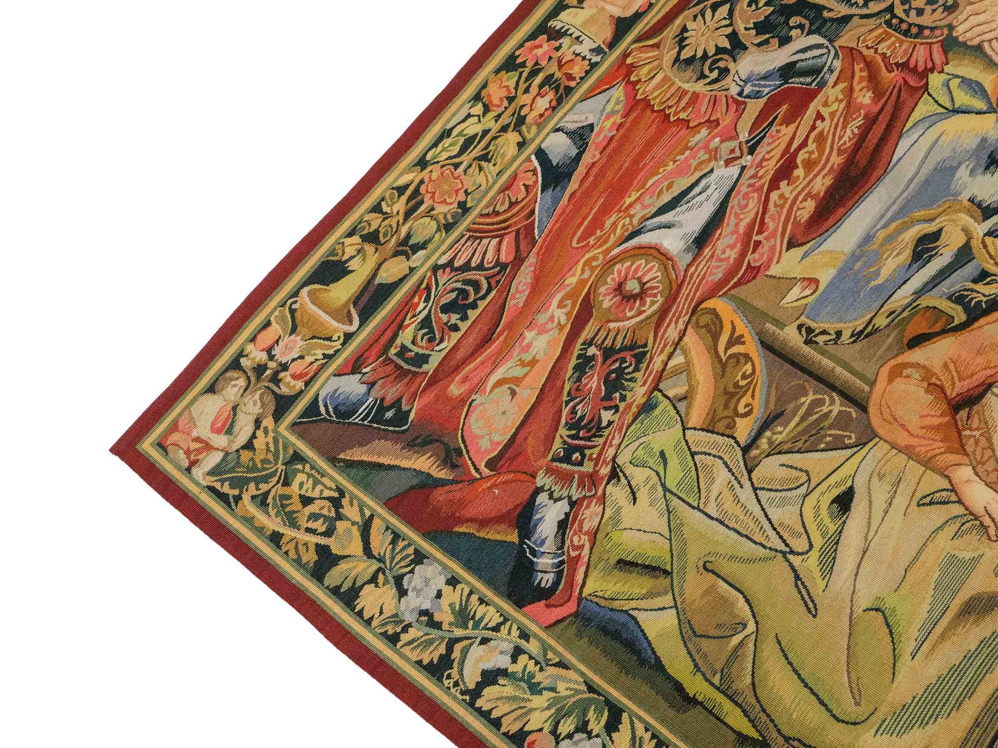 Embark on a journey through time with this handcrafted Chinese wall tapestry in a charming Gobelin design. The floral border, adorned with cherubs, frames an impressive tableau depicting five people—one, crowned and dressed in splendid garments, is seated in a throne room supported by ornate columns. In the background, nature unfolds, creating a fascinating contrast to the opulent scene.