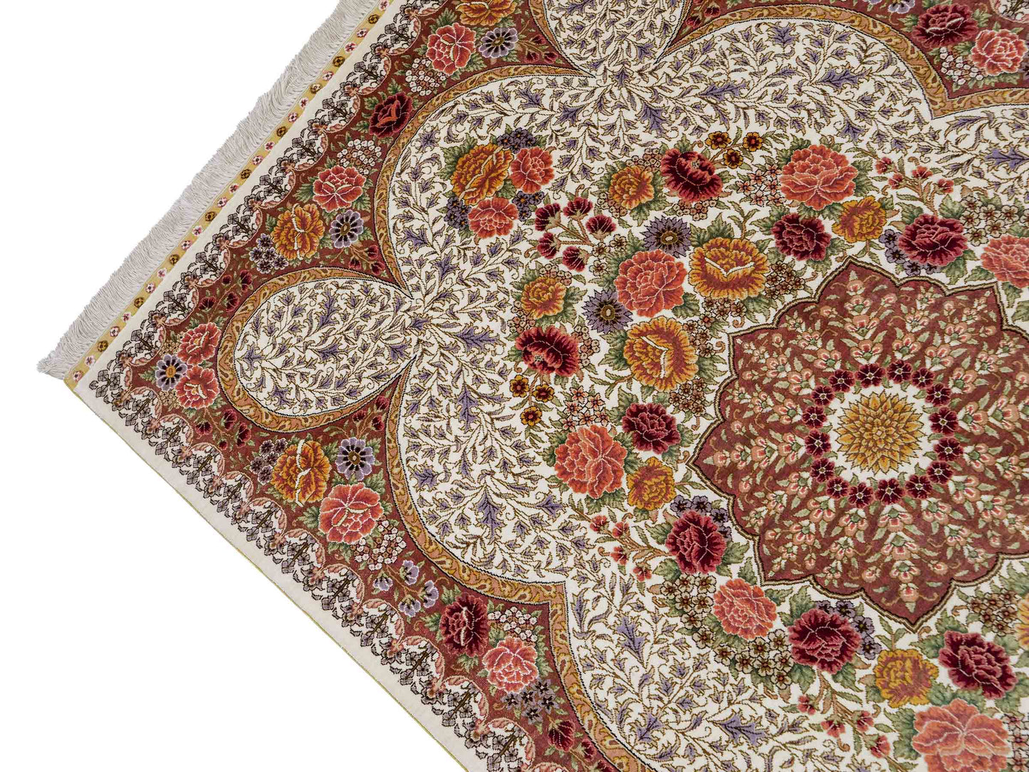 The pile and warp are made of pure silk, which not only grants the rug incredible worth, an unparalleled tactile experience, and breathtaking beauty but also imparts a uniquely shimmering appearance under different angles and lighting conditions.
